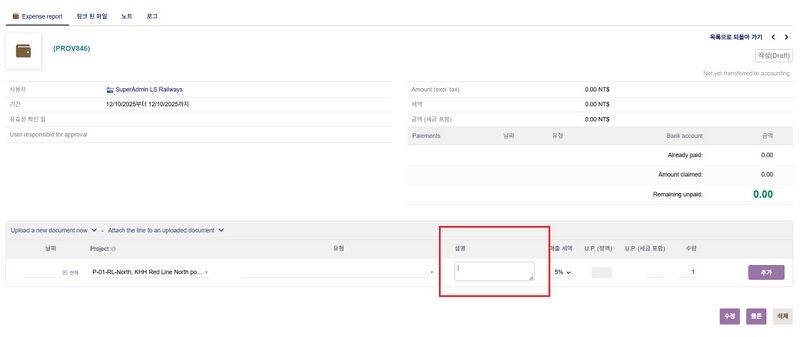 • Description 필드 활용 - Expense Report에서 세부 작성으로 들어간 다음 (note 작성 이후)