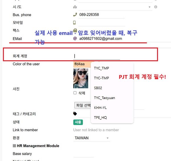 사용하는 email을 등록 하기 (초기엔 회사메일로 해도 됨) - 비번 잊어 버렸다고 관리자에게 계속 연락 오므로, 실사용 email 등록 권장