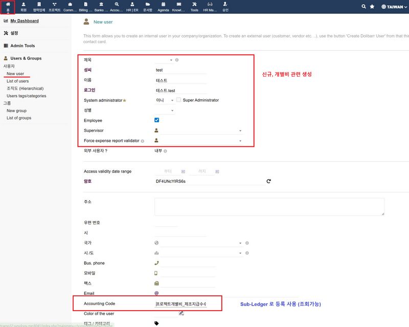 5. 사용자 #1,#2, ..., #6를 주고, 조직을 PJT_개별비 항목으로 함 : Sub-ledger로 등록해서(Accounting Code) 개별비를 사용하는 경우 (인원 혹은 조직으로 구분되어 집계 가능)