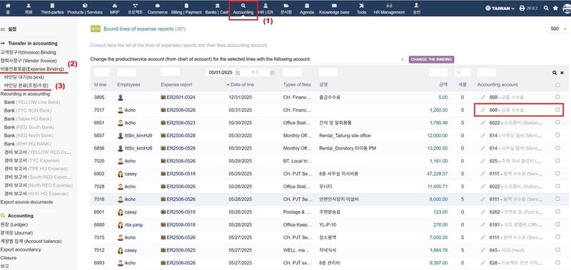 • Accouting에서 이미 binding 된 것 수정 (해당 전표 찾아서 수정 버튼 클릭)