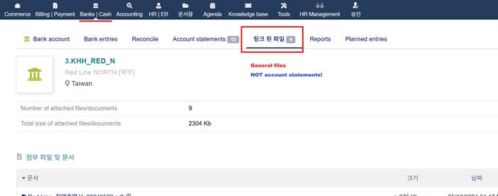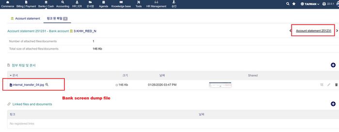 3) 은행 계좌 화면 덤프(screen dump) 파일을 파일링크(Linked files)를 click후 은행 화면 파일을 업로드 한다.