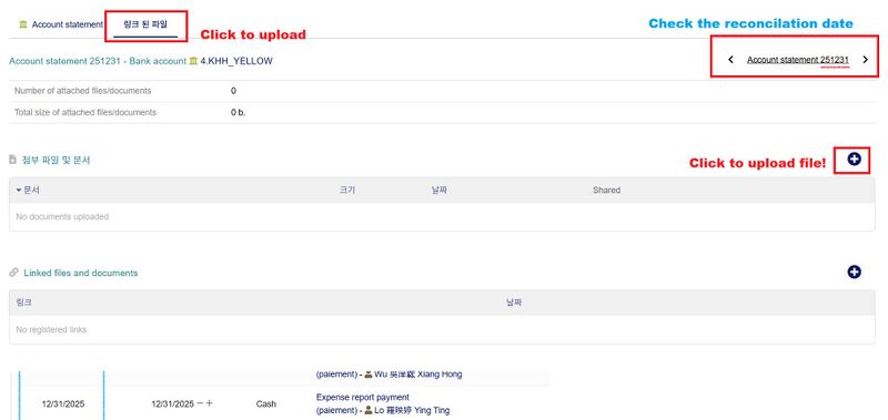 그동안은 기간과 상관없이 reconcile date와 file upload가 상관 없이 하였다. 하지만, 2026년 부터는 반드시 해당 월의 잔고 증명은 해당월의 Linked files에 upload해야 한다.
