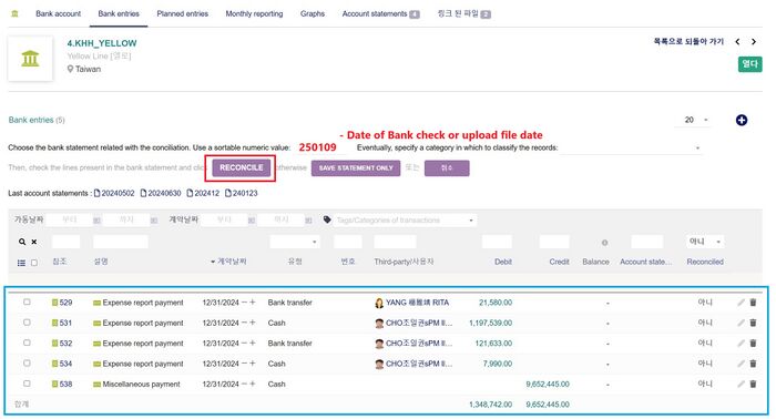 2) Reconcile date를 입력 한다: 예를 들어 251231 - 25년 12월월달 실제 은행 내역을 Reconcile하는 경우