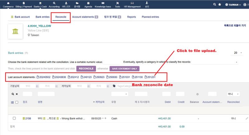 3. 생성된 Bank Reconcile date를 클릭하여 file upload를 클릭한다.