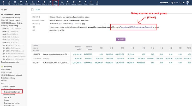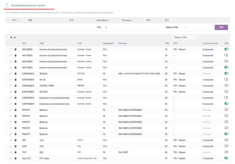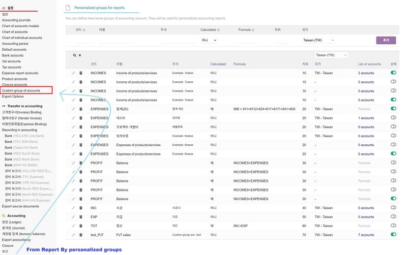 - 그룹 목록 보기 - 사전에 정의한 회계코드 묶음에 따라 구별하여 조회할 수 있음