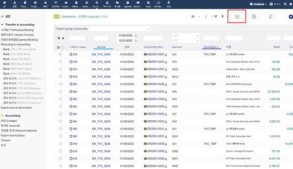 - 목록 보기 - 회계보고서(Journal)별, 부서/프로젝트 회계코드(보조계정) 등으로 구분하여 조회 할 수 있다.