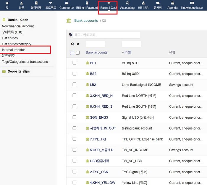 은행(Bank) 메뉴에서 Internal transfer를 선택한다.